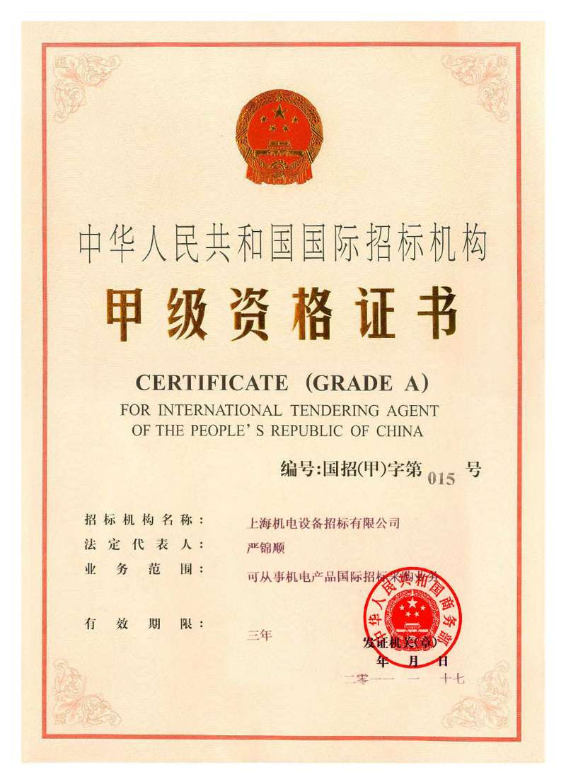 國家對(duì)外貿(mào)易經(jīng)濟(jì)合作部授予的首批《國際招標(biāo)機(jī)構(gòu)甲級(jí)資格證書》。